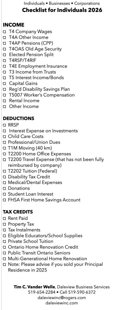 Please review this handy checklist or download as a pdf for your 2025 tax year to help you determine if you’ve received all your forms and receipts and then contact us – 519-654-2284 or email daleviewinc@rogers.com. You may also call and arrange to drop them off at my home office in Cambridge, Ontario. Click here if you are looking for a Business Tax Checklist.