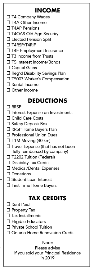 Please review this handy checklist to determine if you’ve received all your forms and receipts and then contact us. To download this checklist as a printable pdf, click here.